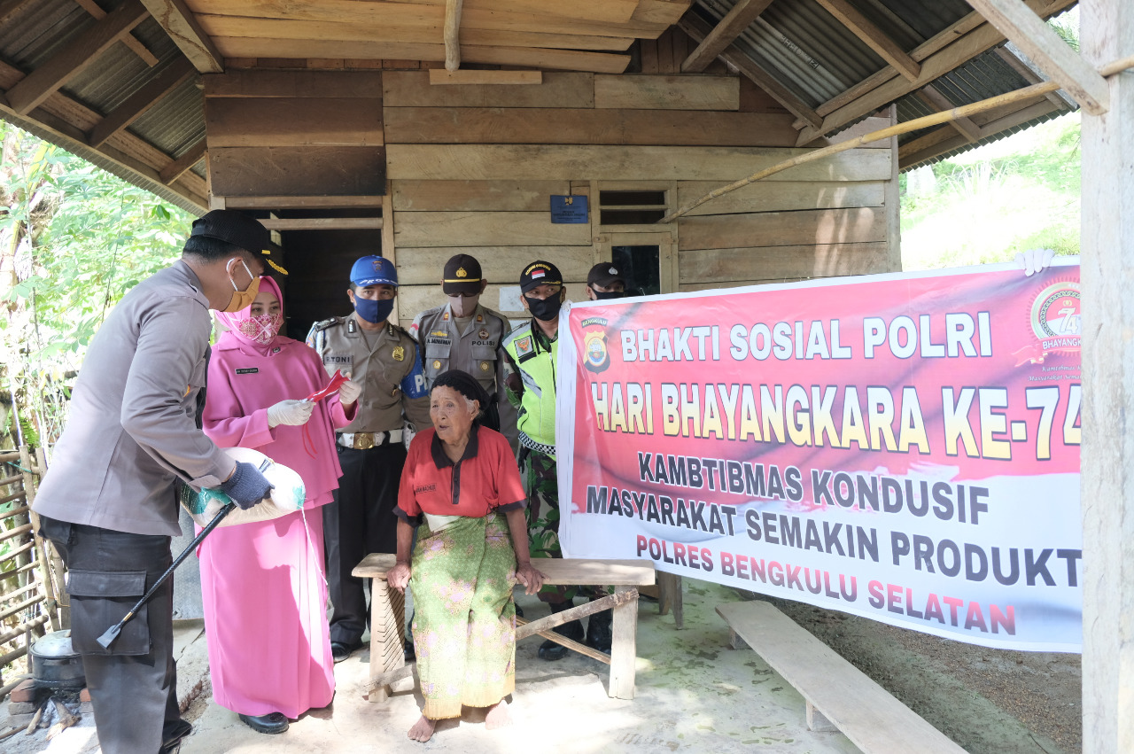 Lensabengkulu.com - Menyambut HUT Bhayangkara ke-74, Kapolres Bengkulu Selatan Polda Bengkulu AKBP Deddy Nata S.IK didampingi Ketua Cabang Bhayangkari Bengkulu Selatan, Dessy Deddy bersama Kapolsek Pino Raya Iptu Sukari SE dan jajarannya, menyalurkan paket bantuan beras kepada warga tidak mampu di Kecamatan Pino Raya, Kamis (18/6/2020).