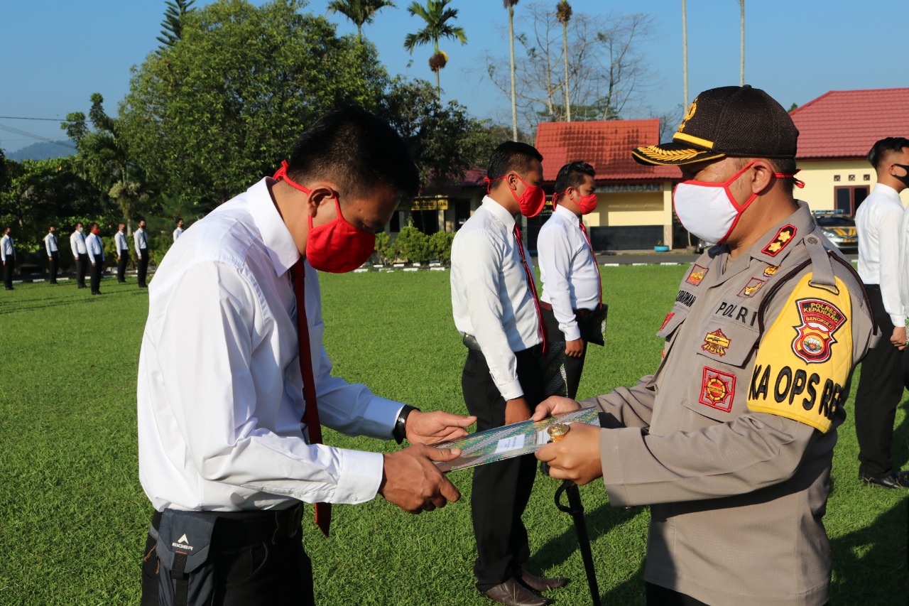 Lensabengkulu.com - Polres Kepahiang memberikan penghargaan kepada 9 Anggota Sat Reskrim Polres Kepahiang atas prestasinya berhasil menangkap burin kasus pencurian dengan kekerasan yang terjadi di Talang Marto Desa Benuang Galing Kecamatan Seberang Musi Kabupaten Kepahiang tahun 2016 lalu. Penghargaan diberikan langsung oleh Kapolres Kepahiang AKBP Suparman S.IK M.Ap bersama pejabat Polres Kepahiang, di Mapolres Kepahiang, Senin (15/6/2020) pagi.